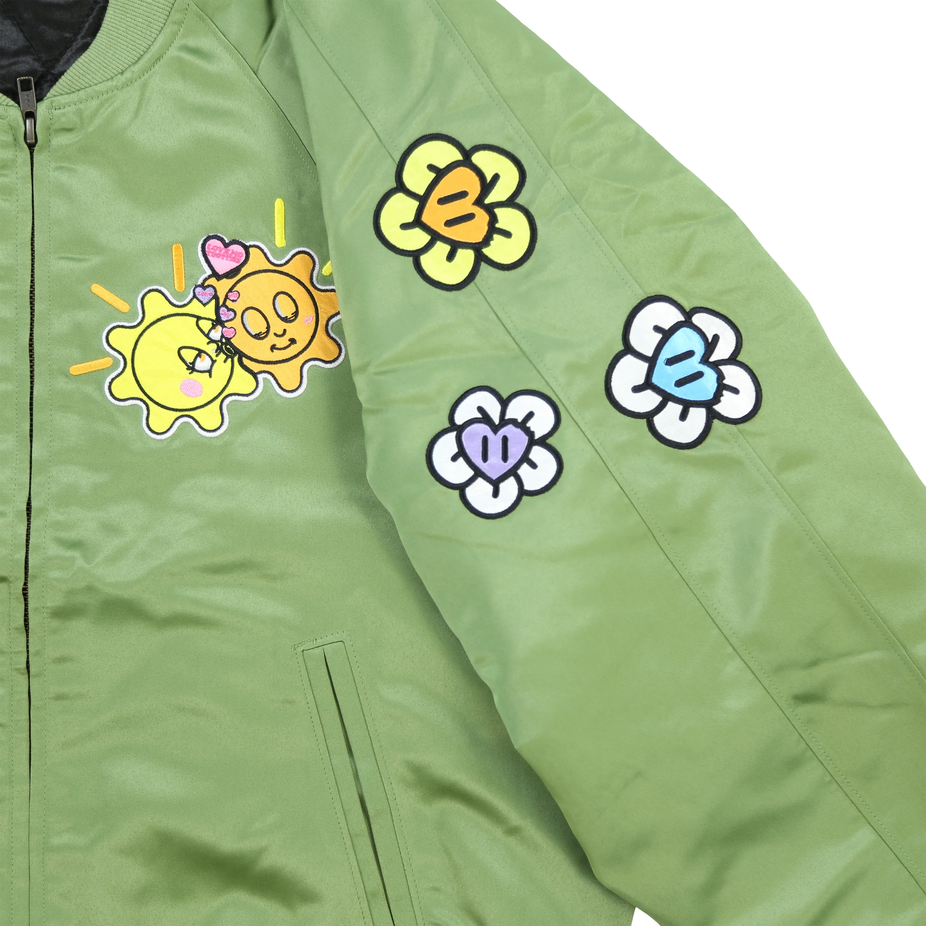 100% Polyester Heavy Satin Zip up jacket with Embroidery Patch Artwork.